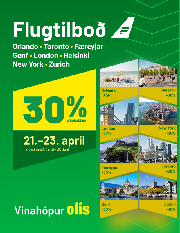 Dagana 21.-23.apríl bjóða Icelandair og Vinahópur Olís bjóða Saga Club félögum sem safna Vildarpunktum hjá Olís og ÓB 30% afslátt af Economy Standard og Saga Premium fargjöldum til átta spennandi borga með afsláttarkóðanum: OLIS, sama hvort greitt sé með Vildarpunktum eða öðrum greiðsluleiðum.
